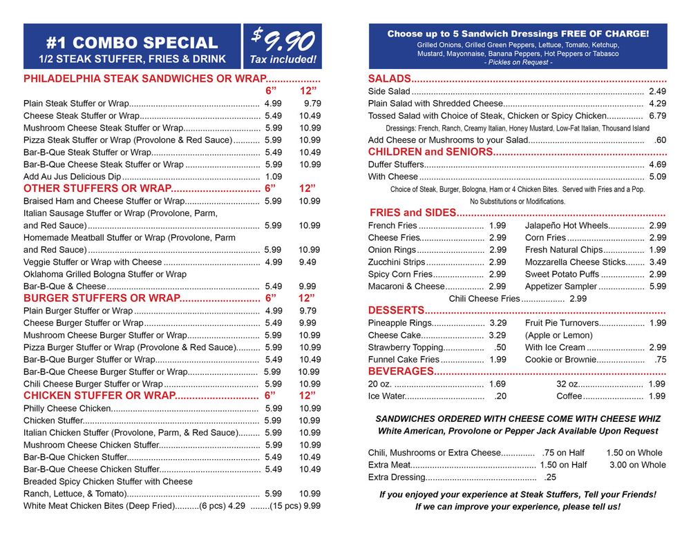 Introducing the menu at Steak Stuffers USA, located in Tulsa, OK, offers a mouth-watering selection of cheesesteaks and sandwiches. From their famous 12" Burger Stuffers to their delectable Philadelphia Steak Sandwiches, the menu is packed with flavorful options like BBQ Cheese Steak Stuffer and Mushroom Cheese Steak Stuffer. Customers rave about the quality of the food, with reviews praising the Cheese Steak as one of the best in the region. The locally-owned casual dining spot is known for its friendly and efficient staff, hot and delicious fries, and a wide variety of cheesesteak variations. Whether you're a fan of classic cheesesteaks or looking to try something new like Braised Ham & Cheese Stuffer, Steak Stuffers USA promises a satisfying dining experience. With easy parking, quick service, and a cozy dining area, this spot is a must-visit for steak sandwich enthusiasts.